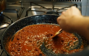 - Adicione o tomate e deixe reduzir até obter uma textura de pasta. Refresque a mistura com vinho branco e deixe reduzir até perder o álcool..